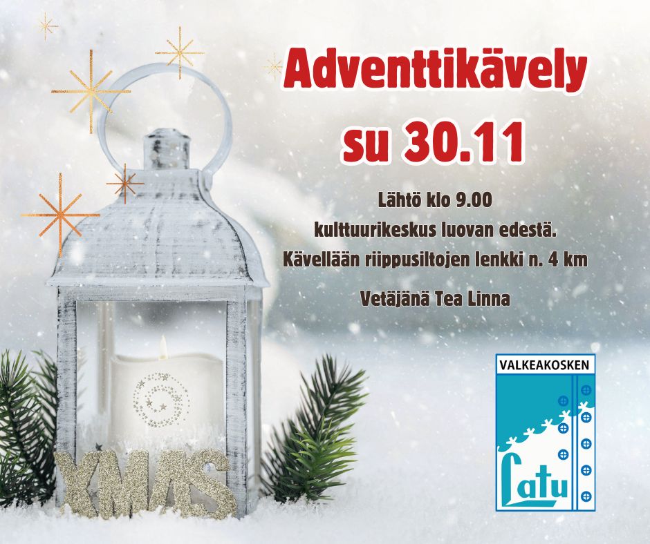 30.11. Adventtikävely. Kaikille avoin. Tapaaminen klo 9.00 Kulttuurikeskus Luovan edessä. Kävellään riippusiltojen lenkki n. 4 km. Vetäjänä Tea Linna.